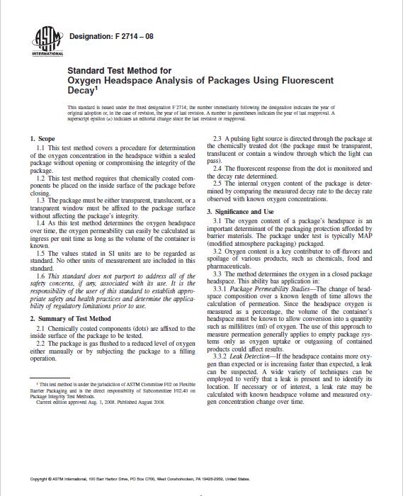 ASTM F2714-08 使用熒光衰減法分析包裝的頂空氧氣